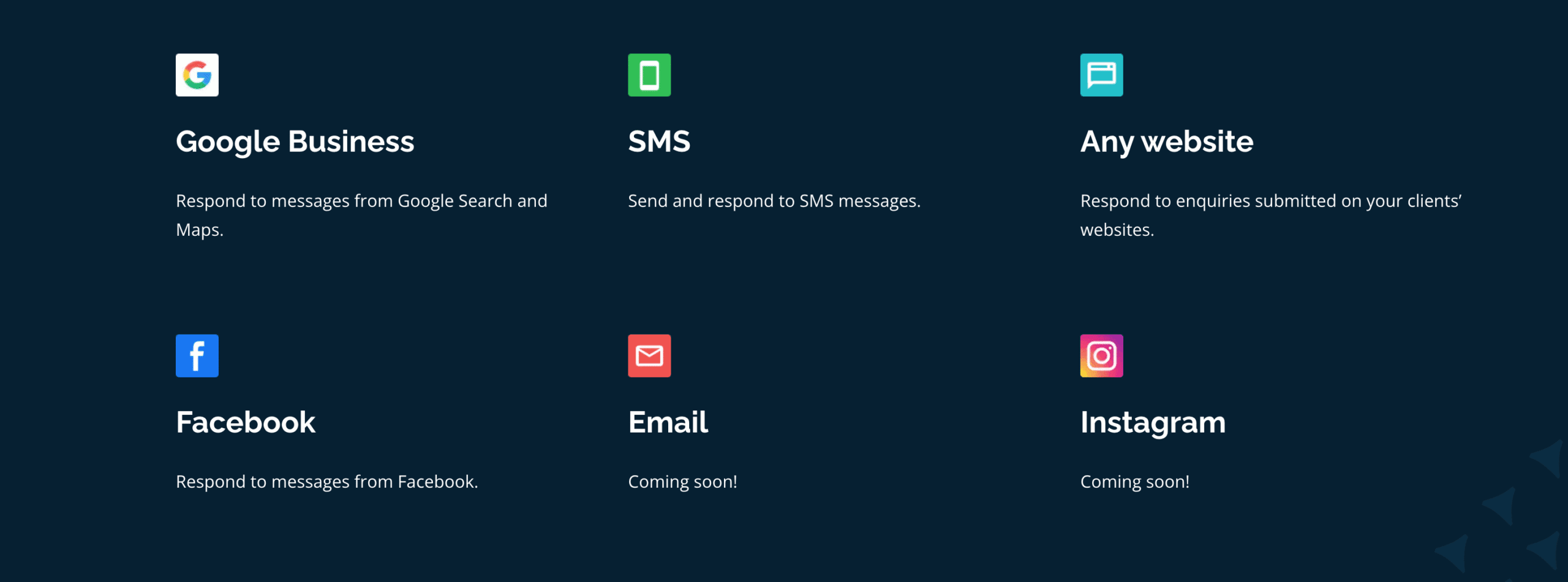 Yes. Your clients can receive and respond to SMS messages, Google Search and Maps inquiries, and Facebook messages, all in one place. Instagram DM support is coming soon.